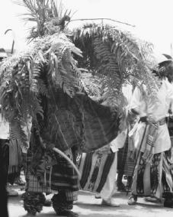 Afrikan fili maskesi giyen erkek. Çoğunlukla palmiye yapraklarından oluşturulan bu gibi aşırı kostümlerle vücudun çoğu kısmı kapatılır.